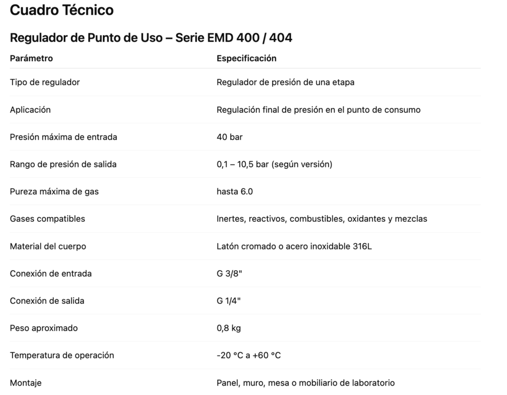 Los reguladores de punto de uso serie EMD 400 / EMD 404 están diseñados para realizar la regulación final de presión dentro de sistemas de distribución de gases en laboratorios. Estos dispositivos se instalan directamente en el área de trabajo, permitiendo ajustar la presión del gas suministrado desde la red a un nivel adecuado para alimentar equipos analíticos o procesos de laboratorio.